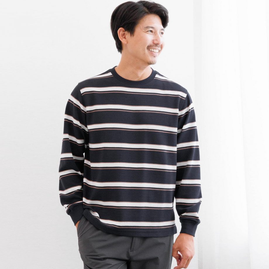 無地・ワンポイント・ボーダーなど表情のあるものを選ぶと、脱いでも洒落見え。